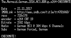 | FiLENAME: | The.Mermaid.German.2016.AC3.BDRip.x264-CHECKMATE.mkv |