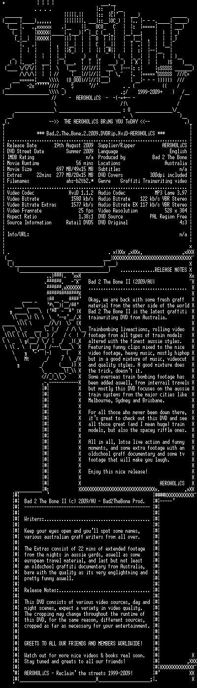 | FiLENAME: | Bad.2.The.Bone.2.2009.DVDRip.XviD-AEROHOLiCS.avi |