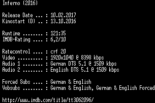 | FiLENAME: | Inferno.2016.German.DTS.DL.1080p.BluRay.x264-COiNCiDENCE.mkv |