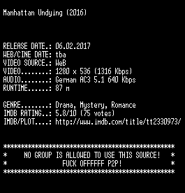 | FiLENAME: | Manhattan.Undying.2016.German.720p.WebHD.X264-SLG.mkv |