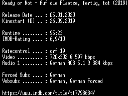 | FiLENAME: | Ready.or.Not.Auf.die.Plaetze.fertig.tot.German.2019.AC3.BDRip.x264-COiNCiDENCE.mkv |