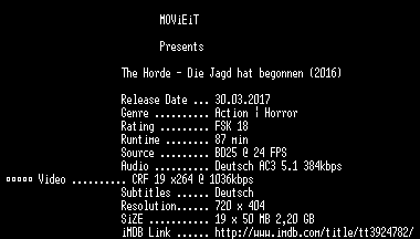 | FiLENAME: | The.Horde.Die.Jagd.hat.begonnen.German.2016.AC3.BDRip.x264-MOViEiT.mkv |