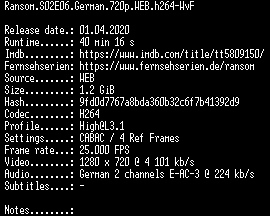 | FiLENAME: | Ransom.S02E06.German.720p.WEB.h264-WvF.mkv |