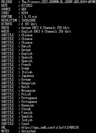 | FiLENAME: | The.Princess.2022.GERMAN.DL.1080P.WEB.H264-WAYNE.mkv |