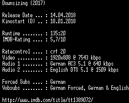 | FiLENAME: | Downsizing.2017.German.DL.1080p.BluRay.x264-COiNCiDENCE.mkv |