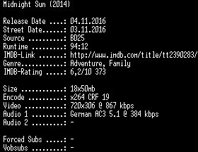 | FiLENAME: | Midnight.Sun.German.2014.AC3.BDRip.x264-SPiCY.mkv |