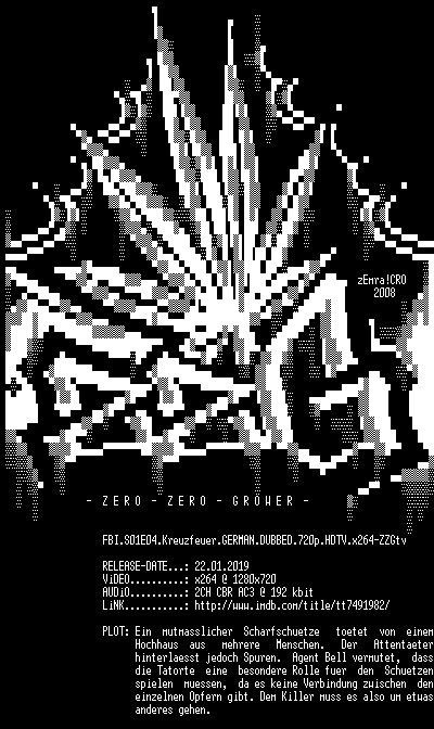 | FiLENAME: | FBI.S01E04.Kreuzfeuer.GERMAN.DUBBED.720p.HDTV.x264-ZZGtv.mkv |