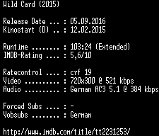 | FiLENAME: | Wild.Card.EXTENDED.German.2015.AC3.BDRip.x264-COiNCiDENCE.mkv |