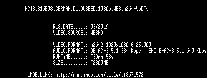 | FiLENAME: | NCIS.S16E08.GERMAN.DL.DUBBED.1080p.WEB.h264-VoDTv.mkv |