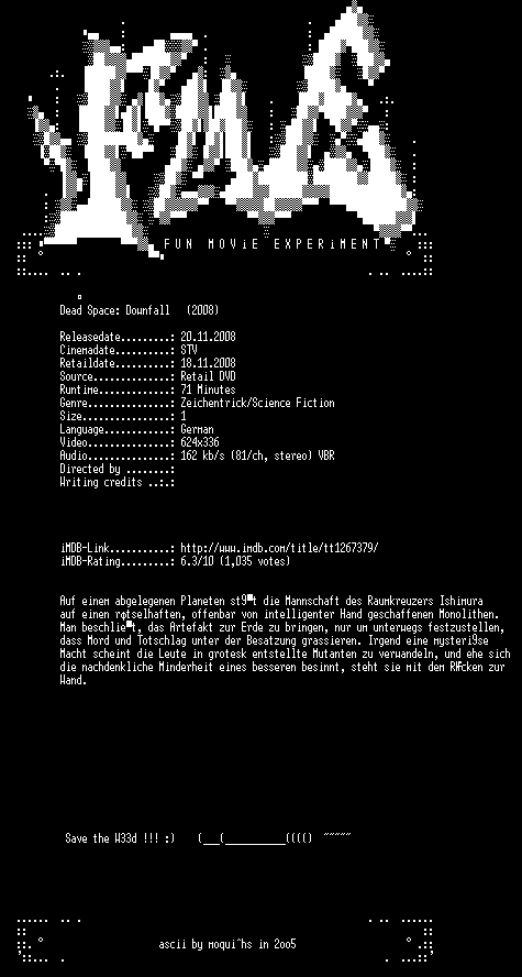 | FiLENAME: | Dead.Space.Downfall.German.2008.DVDRiP.XviD-FmE.avi |