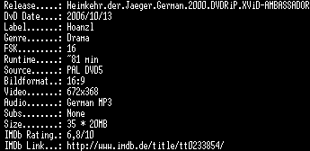 | FiLENAME: | Heimkehr.der.Jaeger.German.2000.DVDRiP.XViD-AMBASSADOR.avi |