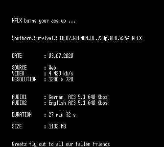 | FiLENAME: | Southern.Survival.S01E07.GERMAN.DL.720p.WEB.x264-NFLX.mkv |