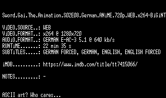 | FiLENAME: | Sword.Gai.The.Animation.S02E08.German.ANiME.720p.WEB.x264-BiGiNT.mkv |