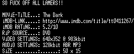 | FiLENAME: | The.Dark.German.DVDRiP.XviD-FUCKOFF.avi |