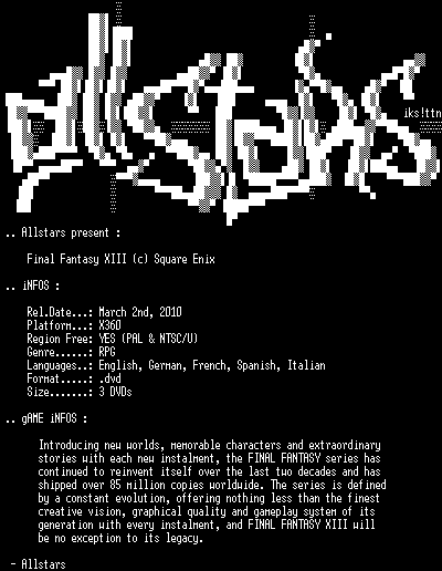 | FiLENAME: | Final.Fantasy.XIII.Disc1.X360-Allstars.iso |