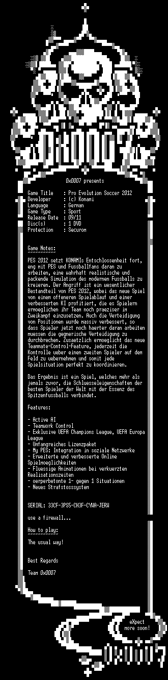 | FiLENAME: | Pro.Evolution.Soccer.2012.GERMAN-0x0007.iso |