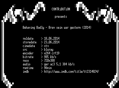 | FiLENAME: | Behaving.Badly.Brav.sein.war.gestern.2014.German.BDRip.x264-CONTRiBUTiON.mkv |