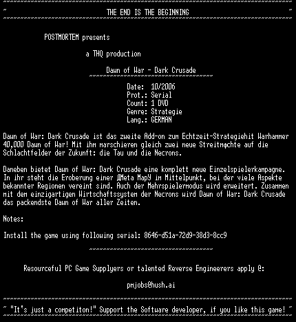 | FiLENAME: | Warhammer.40000.Dawn.of.War.Dark.Crusade.GERMAN-POSTMORTEM.iso |