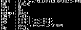 | FiLENAME: | Schitts.Creek.S06E11.GERMAN.DL.720P.WEB.X264-WAYNE.mkv |