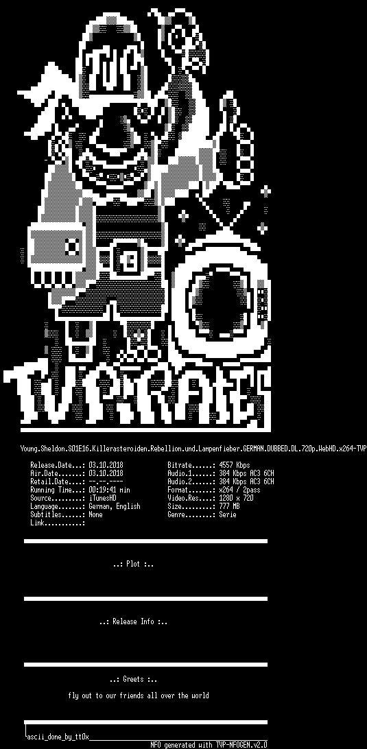 | FiLENAME: | Young.Sheldon.S01E16.Killerasteroiden.Rebellion.und.Lampenfieber.GERMAN.DUBBED.DL.720p.WebHD.x264-TVP.mkv |