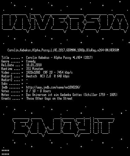| FiLENAME: | Carolin.Kebekus.Alpha.Pussy.LiVE.2017.GERMAN.1080p.BluRay.x264-UNiVERSUM.mkv |