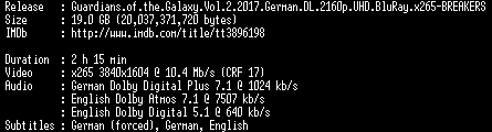 | FiLENAME: | Guardians.of.the.Galaxy.Vol.2.2017.German.DL.2160p.UHD.BluRay.x265-BREAKERS.mkv |