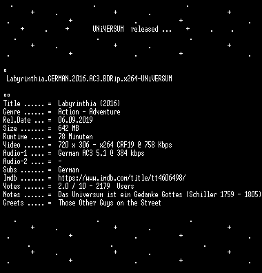 | FiLENAME: | Labyrinthia.GERMAN.2016.AC3.BDRip.x264-UNiVERSUM.mkv |