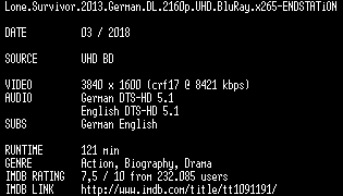 | FiLENAME: | Lone.Survivor.2013.German.DL.2160p.UHD.BluRay.x265-ENDSTATiON.mkv |