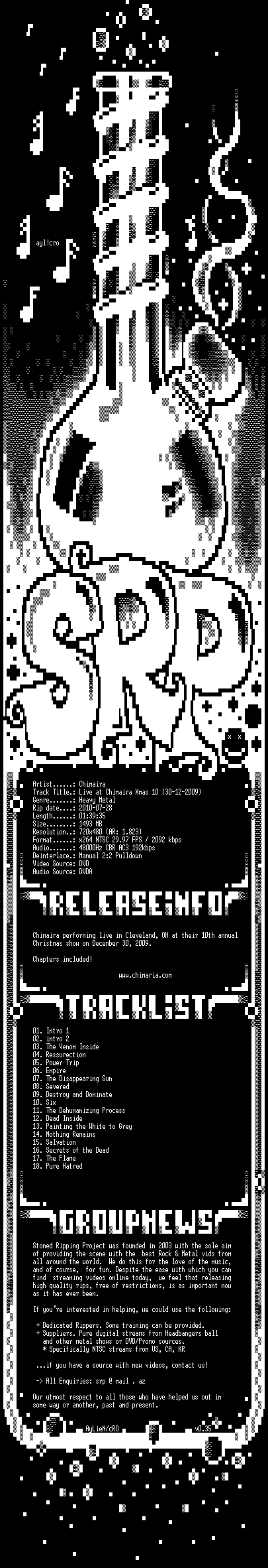 | FiLENAME: | Chimaira-Live_at_Chimaira_Christmas_10_(30-12-2009)-DVDRip-x264-2010-SRP.mkv |