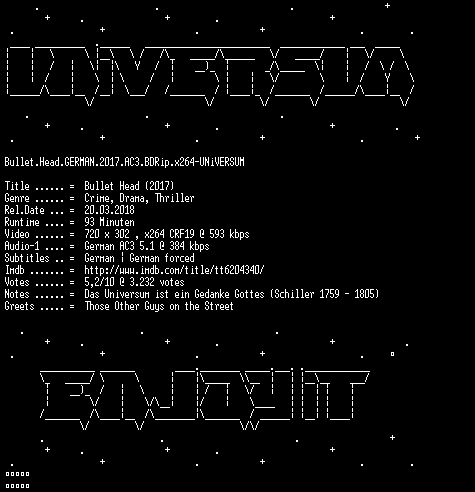 | FiLENAME: | Bullet.Head.GERMAN.2017.AC3.BDRip.x264-UNiVERSUM.mkv |