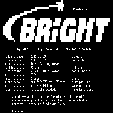 | FiLENAME: | Beastly.German.BDRip.XviD.RERIP-BRiGHT.avi |