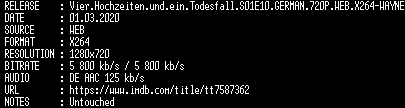 | FiLENAME: | Vier.Hochzeiten.und.ein.Todesfall.S01E10.GERMAN.720P.WEB.X264-WAYNE.mkv |