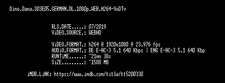 | FiLENAME: | Dino.Dana.S03E05.GERMAN.DL.1080p.WEB.H264-VoDTv.mkv |