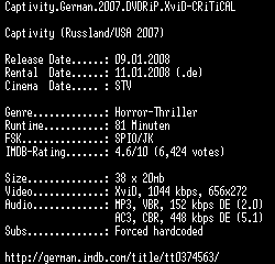 | FiLENAME: | Captivity.German.2007.DVDRiP.XviD-CRiTiCAL.avi |