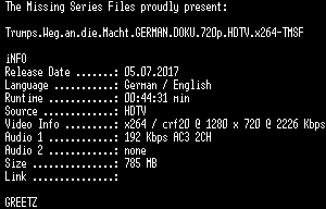 | FiLENAME: | Trumps.Weg.an.die.Macht.GERMAN.DOKU.720p.HDTV.x264-TMSF.mkv |