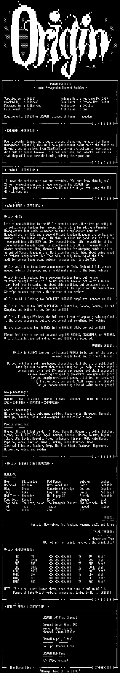 | FiLENAME: | Worms.Armageddon.Wormnet.Enabler-OGN.rar |