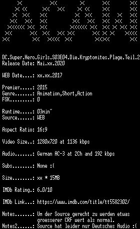| FiLENAME: | DC.Super.Hero.Girls.S03E04.Die.Kryptomites.Plage.Teil.2.German.720p.WebHD.x264-ACAW.mkv |