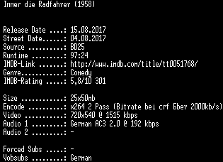 | FiLENAME: | Immer.die.Radfahrer.German.REMASTERED.1958.AC3.BDRip.x264-SPiCY.mkv |