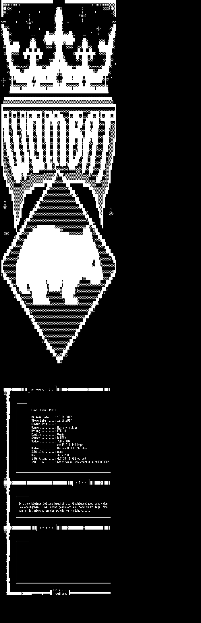 | FiLENAME: | Final.Exam.German.1981.BDRiP.x264-WOMBAT.mkv |