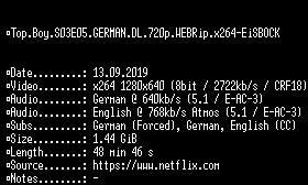 | FiLENAME: | Top.Boy.S03E05.GERMAN.DL.720p.WEBRip.x264-EiSBOCK.mkv |