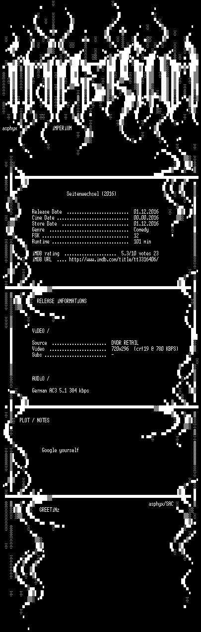 | FiLENAME: | Seitenwechsel.German.2016.AC3.DVDRip.x264-iMPERiUM.mkv |