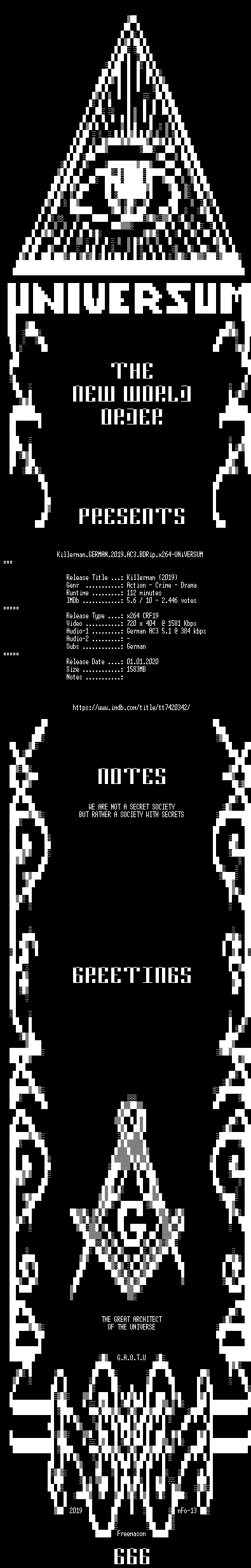 | FiLENAME: | Killerman.GERMAN.2019.AC3.BDRip.x264-UNiVERSUM.mkv |