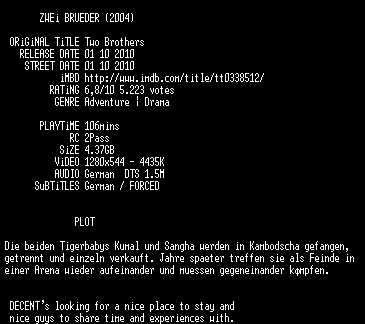 | FiLENAME: | Zwei Brueder (2004) [GER-dts 720p BD].mkv |
