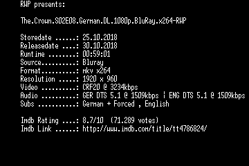 | FiLENAME: | The.Crown.S02E08.German.DL.1080p.BluRay.x264-RWP.mkv |