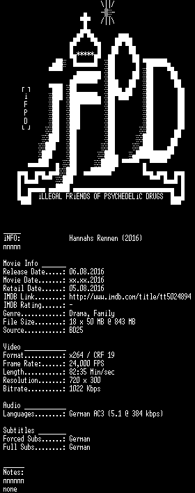 | FiLENAME: | Hannahs.Rennen.German.2016.AC3.BDRiP.x264-iFPD.mkv |