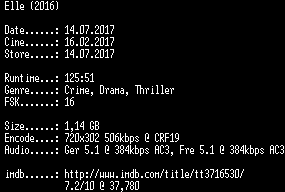 | FiLENAME: | Elle.German.2016.DL.BDRiP.x264-CiNEViSiON.mkv |