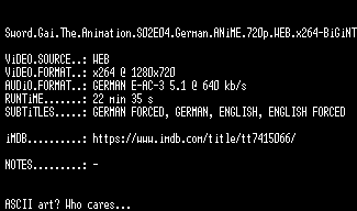 | FiLENAME: | Sword.Gai.The.Animation.S02E04.German.ANiME.720p.WEB.x264-BiGiNT.mkv |