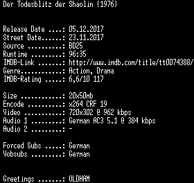 | FiLENAME: | Der.Todesblitz.der.Shaolin.German.REMASTERED.1976.AC3.BDRip.x264-SPiCY.mkv |