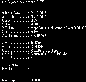 | FiLENAME: | Die.Odyssee.der.Neptun.German.REMASTERED.1973.AC3.BDRip.x264-SPiCY.mkv |