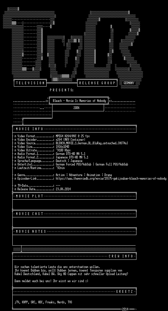 | FiLENAME: | Bleach.-.Movie.1.Memories.of.Nobody.GERMAN.5.1.DL.DTSHD.ANiME.BDRiP.1080p.WS.x264-TvR.mkv |